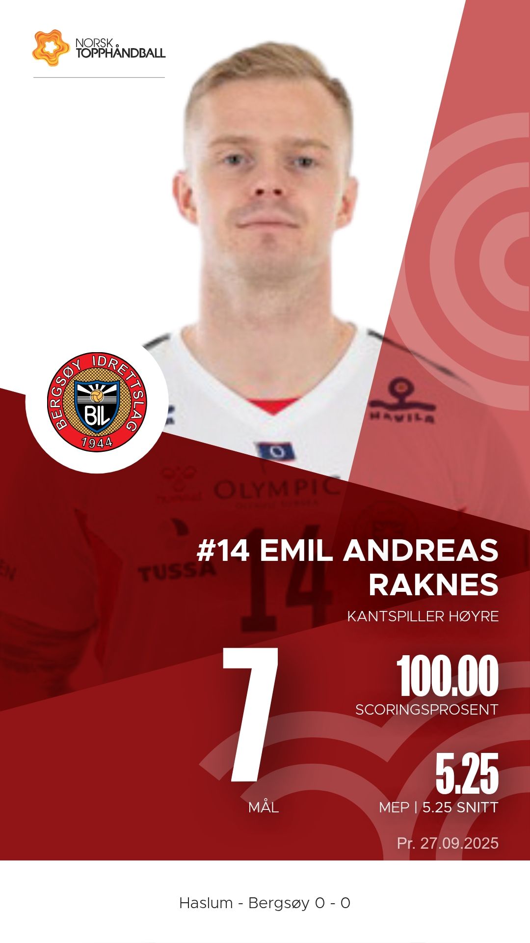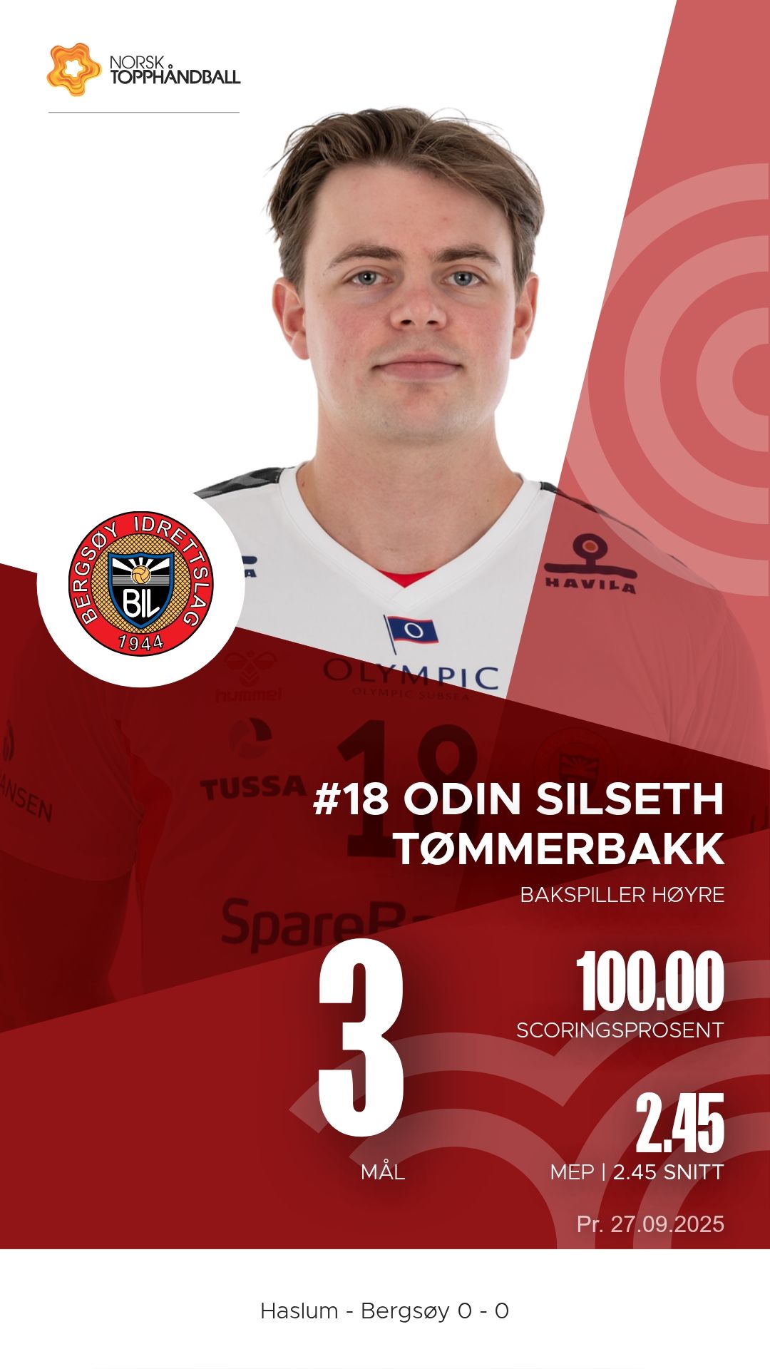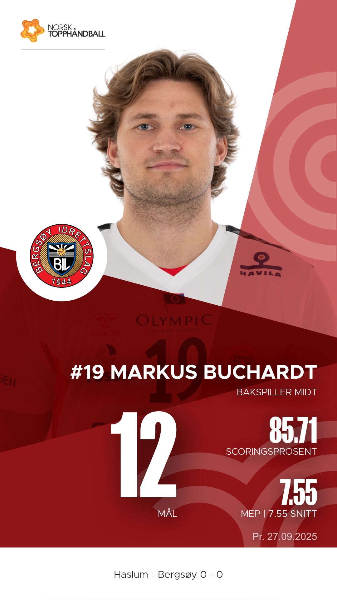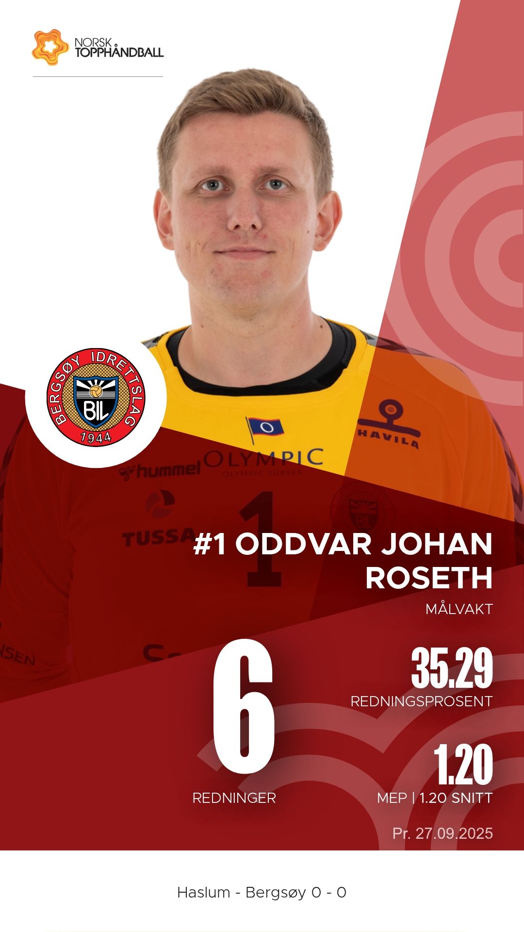 Haslum Håndballklubb tok imot Bergsøy i Nadderud Arena lørdag 27. september 2025 i 1. divisjon sesongen 2025/2026. Etter en intens kamp var det bortelaget Bergsøy som kunne juble for en viktig seier, 34–31.