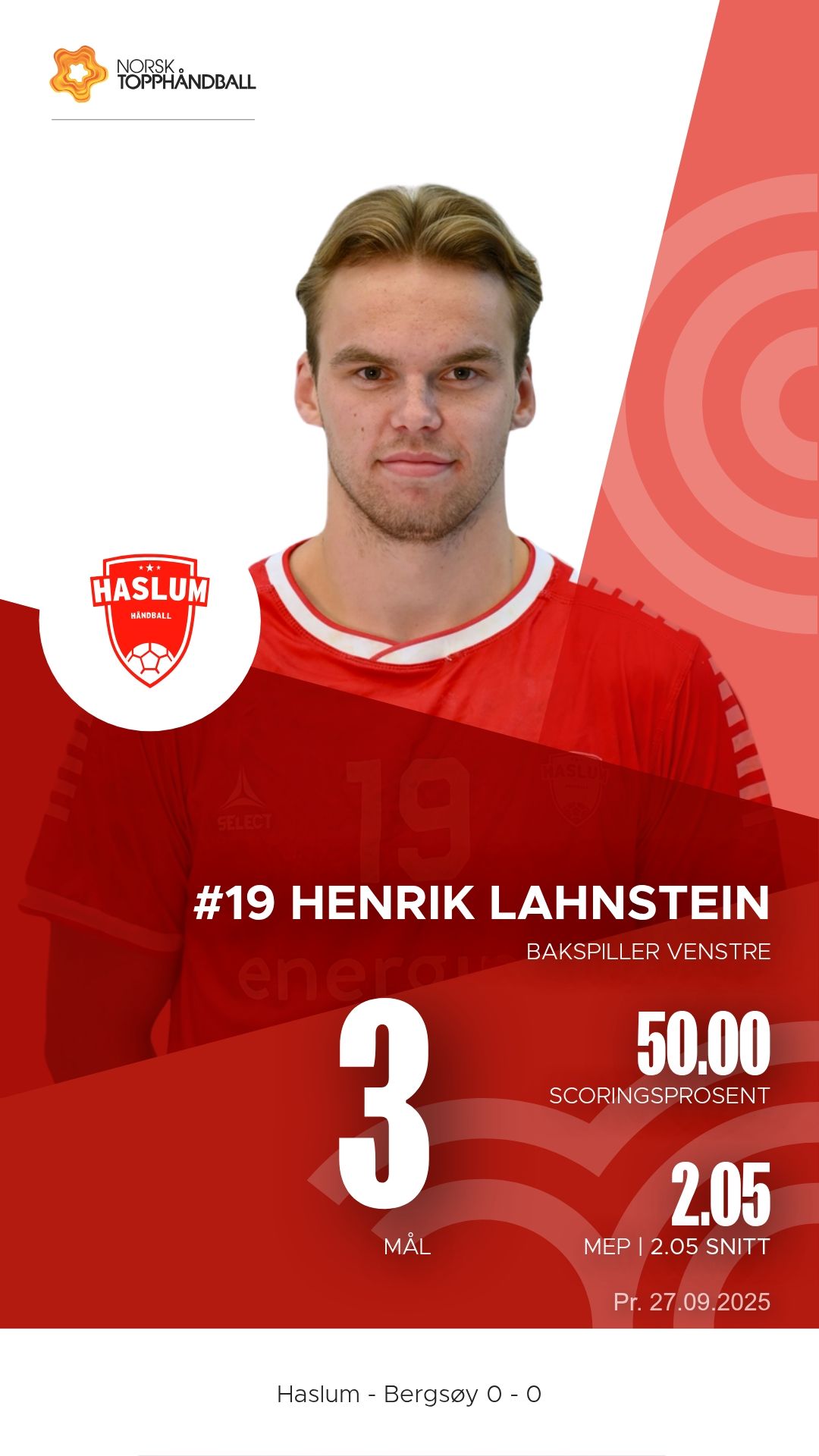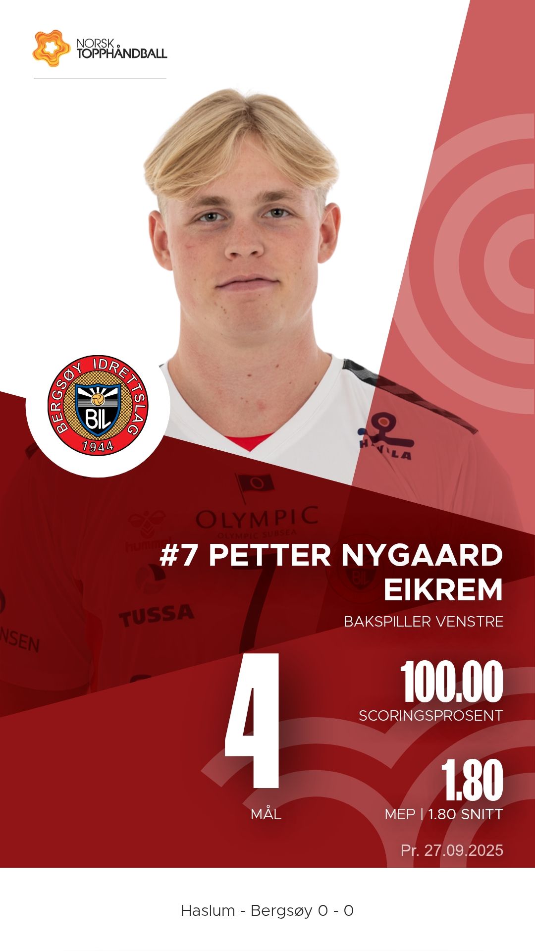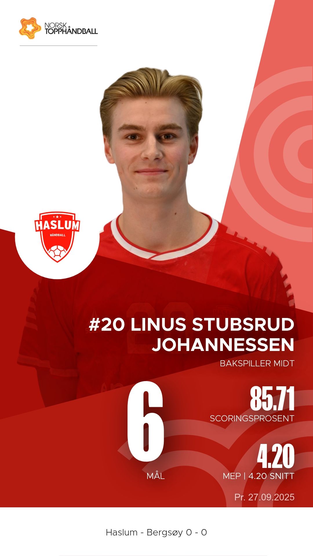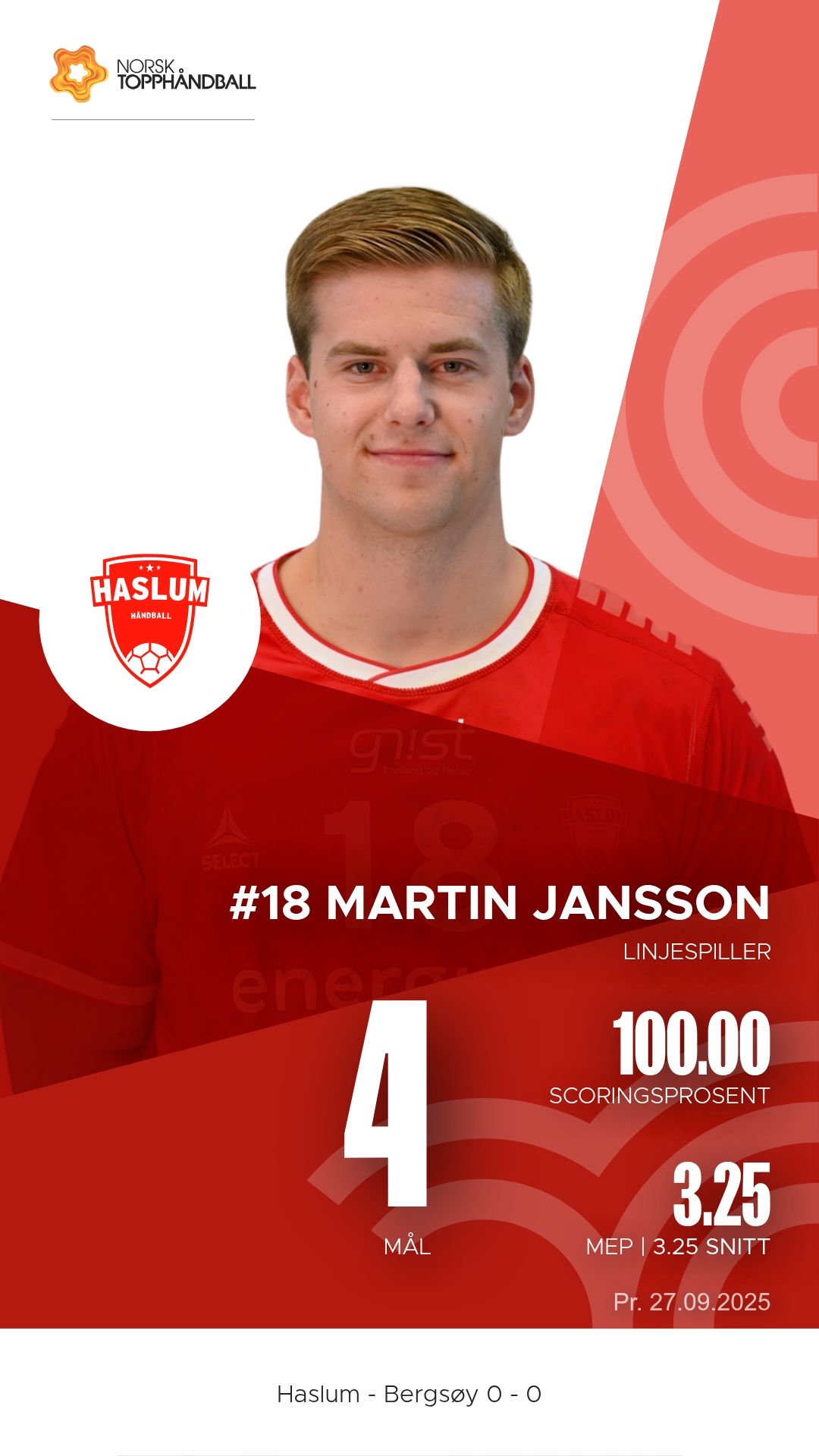 Haslum Håndballklubb tok imot Bergsøy i Nadderud Arena lørdag 27. september 2025 i 1. divisjon sesongen 2025/2026. Etter en intens kamp var det bortelaget Bergsøy som kunne juble for en viktig seier, 34–31.