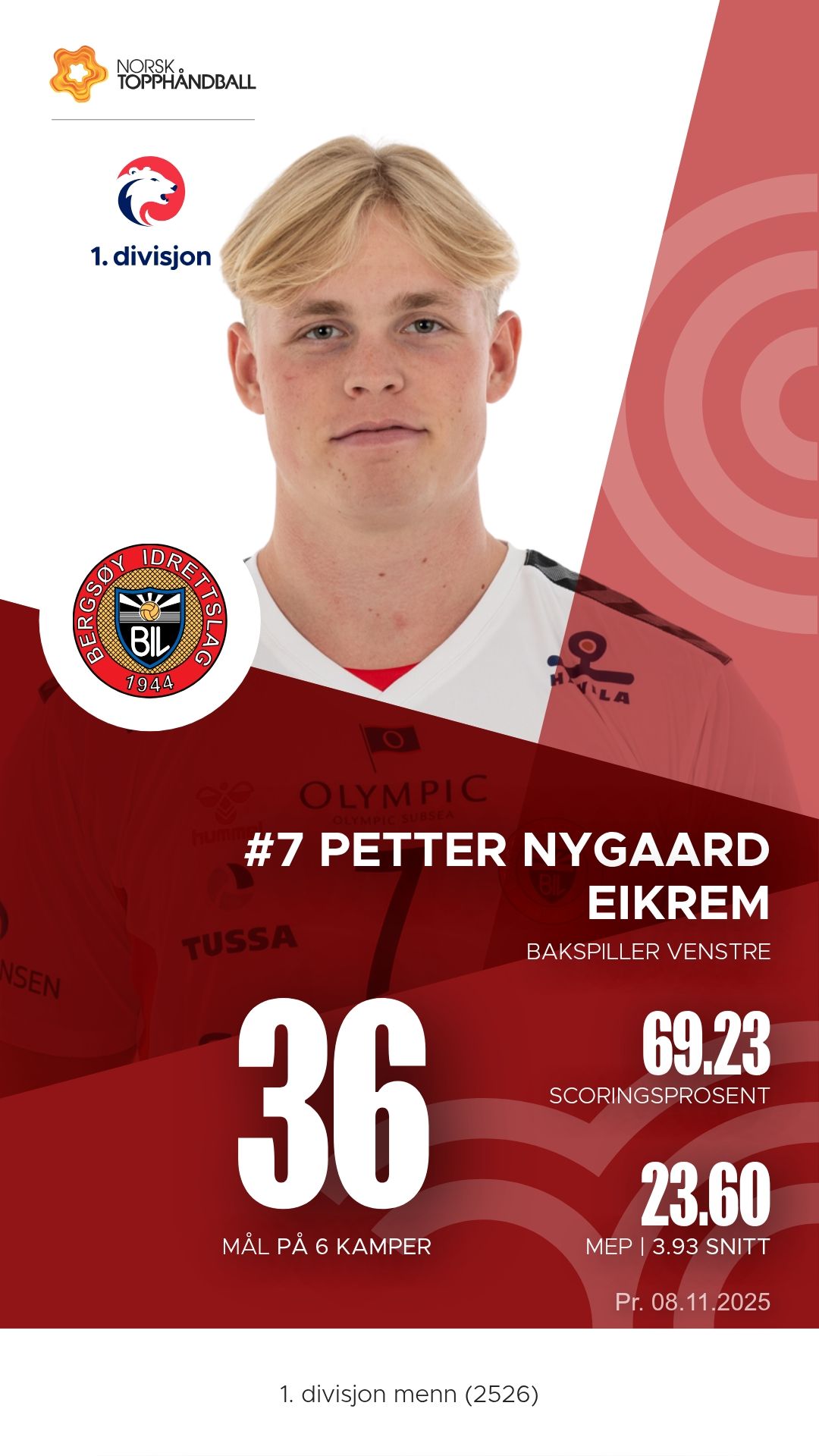For Bergsøy har flere profiler stått frem i høst. Markus Buchardt er lagets motor i angrepsspillet, en playmaker med både blikk og presisjon som stadig finner åpningene i motstanderens forsvar. Med både mål og assist på høyt nivå har han vært en av divisjonens mest effektive spillere. På bakspillerplassen har Petter Nygaard Eikrem levert solid skyting fra distanse og vært en konstant trussel med sitt kraftfulle stegskudd. Kantspilleren Emil Andreas Raknes har også markert seg med høy treffprosent og raske kontringer som setter fart i Bergsøys overgangsspill. I tillegg har målvakt Sigvart Kval vært en bauta bakerst, med redninger som har reddet laget i flere jevne perioder.